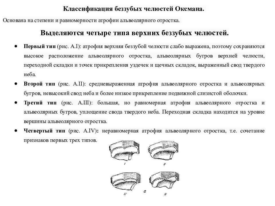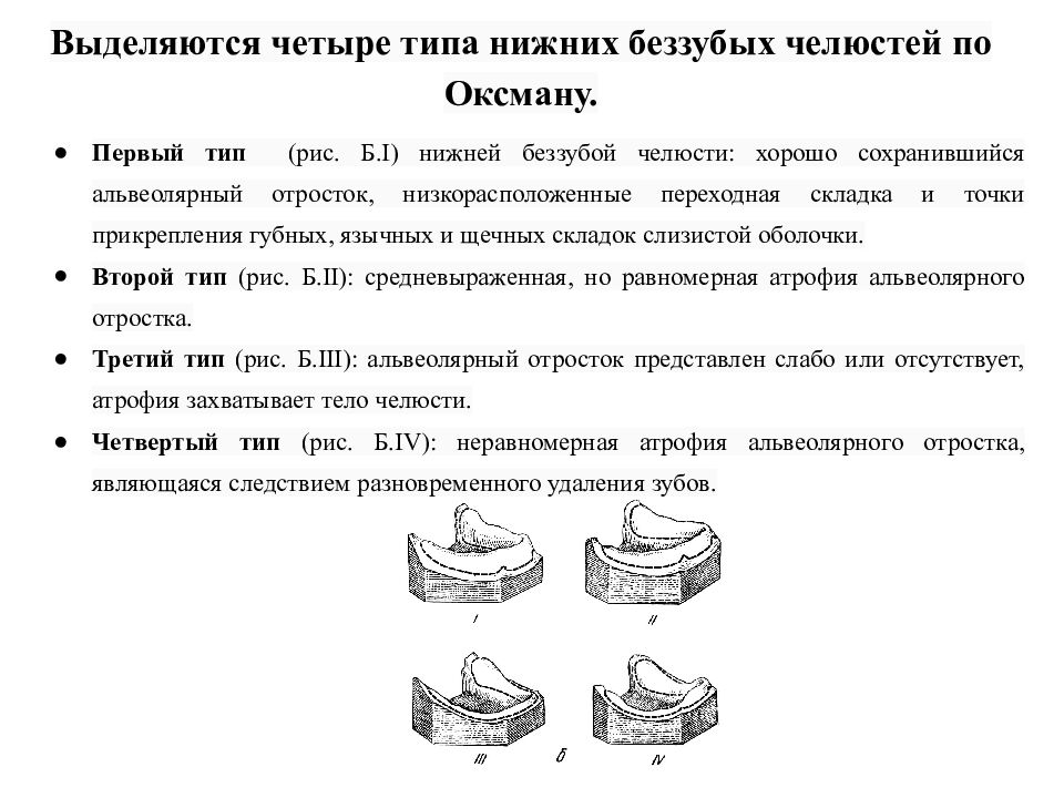 Выделяются четыре типа нижних беззубых челюстей по Оксману. Первый тип (рис. Б.I) нижней беззубой челюсти: хорошо сохранившийся альвеолярный отросток, низкорасположенные переходная складка и точки прикрепления губных, язычных и щечных складок слизистой оболочки. Второй тип (рис. Б.II): средневыраженная, но равномерная атрофия альвеолярного отростка. Третий тип (рис. Б.III): альвеолярный отросток представлен слабо или отсутствует, атрофия захватывает тело челюсти. Четвертый тип (рис. Б.IV): неравномерная атрофия альвеолярного отростка, являющаяся следствием разновременного удаления зубов.
