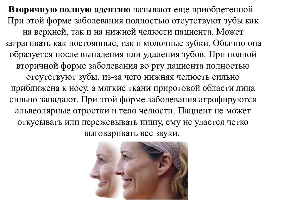 Вторичную полную адентию называют еще приобретенной. При этой форме заболевания полностью отсутствуют зубы как на верхней, так и на нижней челюсти пациента. Может затрагивать как постоянные, так и молочные зубки. Обычно она образуется после выпадения или удаления зубов. При полной вторичной форме заболевания во рту пациента полностью отсутствуют зубы, из-за чего нижняя челюсть сильно приближена к носу, а мягкие ткани приротовой области лица сильно западают. При этой форме заболевания атрофируются альвеолярные отростки и тело челюсти. Пациент не может откусывать или пережевывать пищу, ему не удается четко выговаривать все звуки.