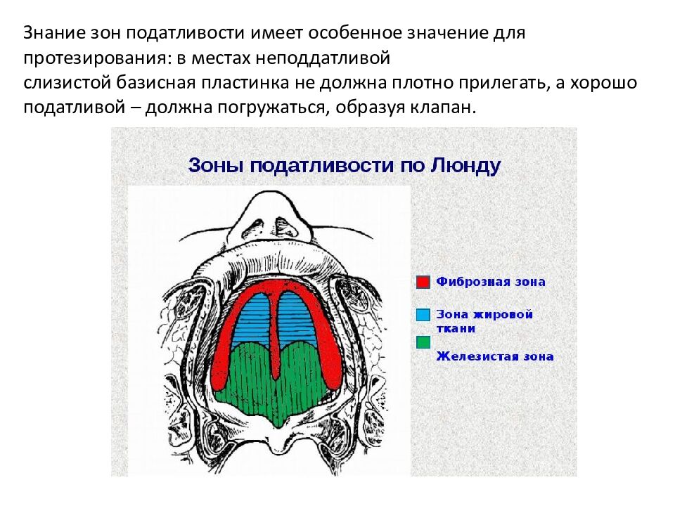 Знание зон податливости имеет особенное значение для протезирования: в местах неподдатливой слизистой базисная пластинка не должна плотно прилегать, а хорошо податливой – должна погружаться, образуя клапан.