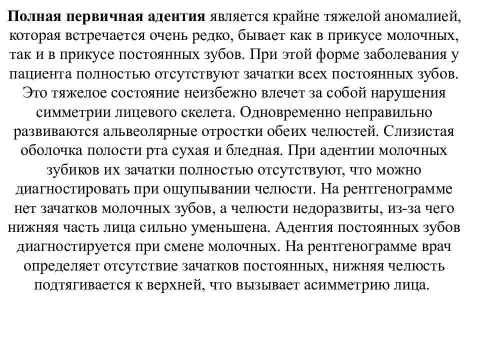 Полная первичная адентия является крайне тяжелой аномалией, которая встречается очень редко, бывает как в прикусе молочных, так и в прикусе постоянных зубов. При этой форме заболевания у пациента полностью отсутствуют зачатки всех постоянных зубов. Это тяжелое состояние неизбежно влечет за собой нарушения симметрии лицевого скелета. Одновременно неправильно развиваются альвеолярные отростки обеих челюстей. Слизистая оболочка полости рта сухая и бледная. При адентии молочных зубиков их зачатки полностью отсутствуют, что можно диагностировать при ощупывании челюсти. На рентгенограмме нет зачатков молочных зубов, а челюсти недоразвиты, из-за чего нижняя часть лица сильно уменьшена. Адентия постоянных зубов диагностируется при смене молочных. На рентгенограмме врач определяет отсутствие зачатков постоянных, нижняя челюсть подтягивается к верхней, что вызывает асимметрию лица.
