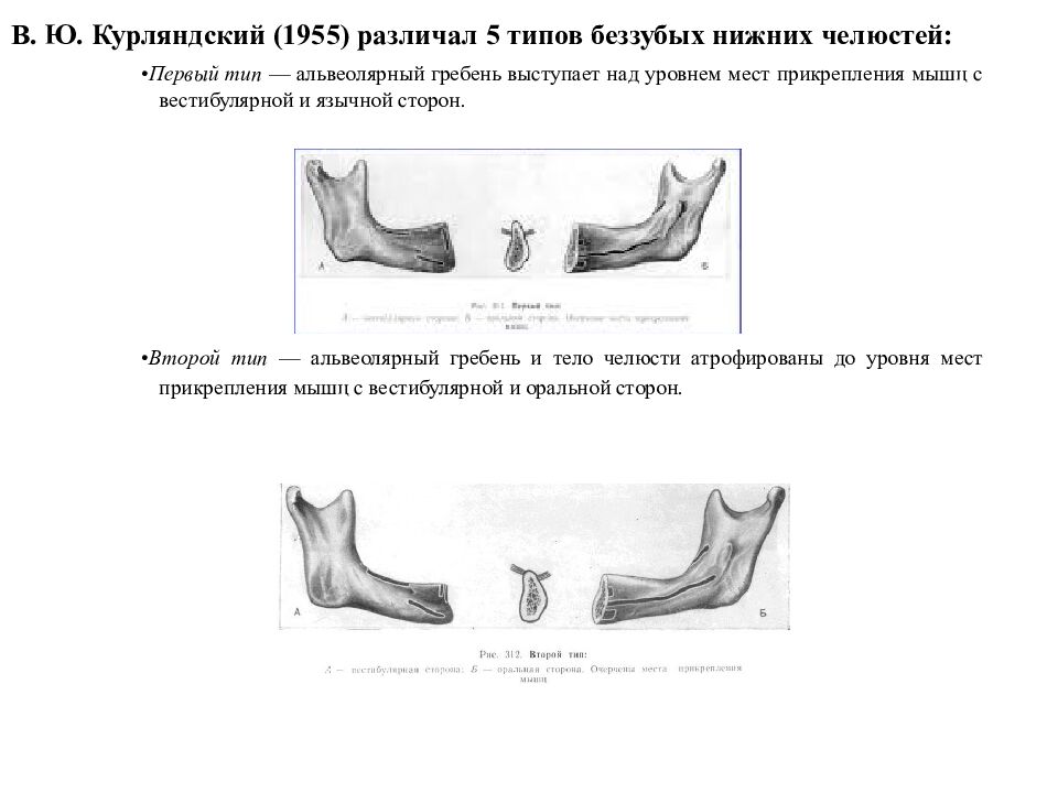 В. Ю. Курляндский (1955) различал 5 типов беззубых нижних челюстей: • Первый тип — альвеолярный гребень выступает над уровнем мест прикрепления мышц с вестибулярной и язычной сторон. • Второй тип — альвеолярный гребень и тело челюсти атрофированы до уровня мест прикрепления мышц с вестибулярной и оральной сторон.