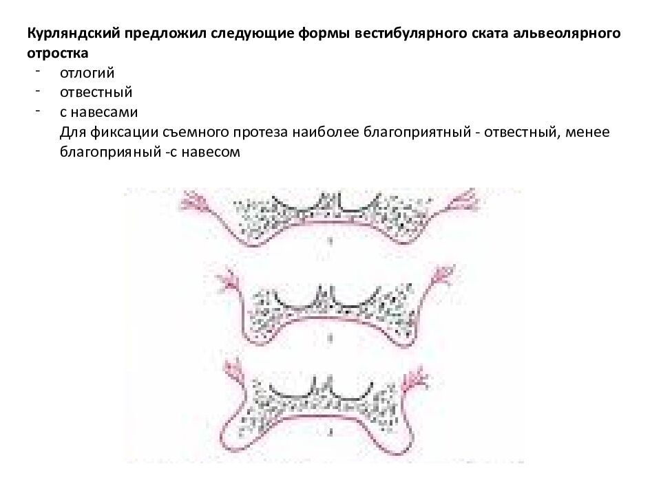 Курляндский предложил следующие формы вестибулярного ската альвеолярного отростка отлогий отвестный с навесами Для фиксации съемного протеза наиболее благоприятный - отвестный, менее благоприяный -с навесом