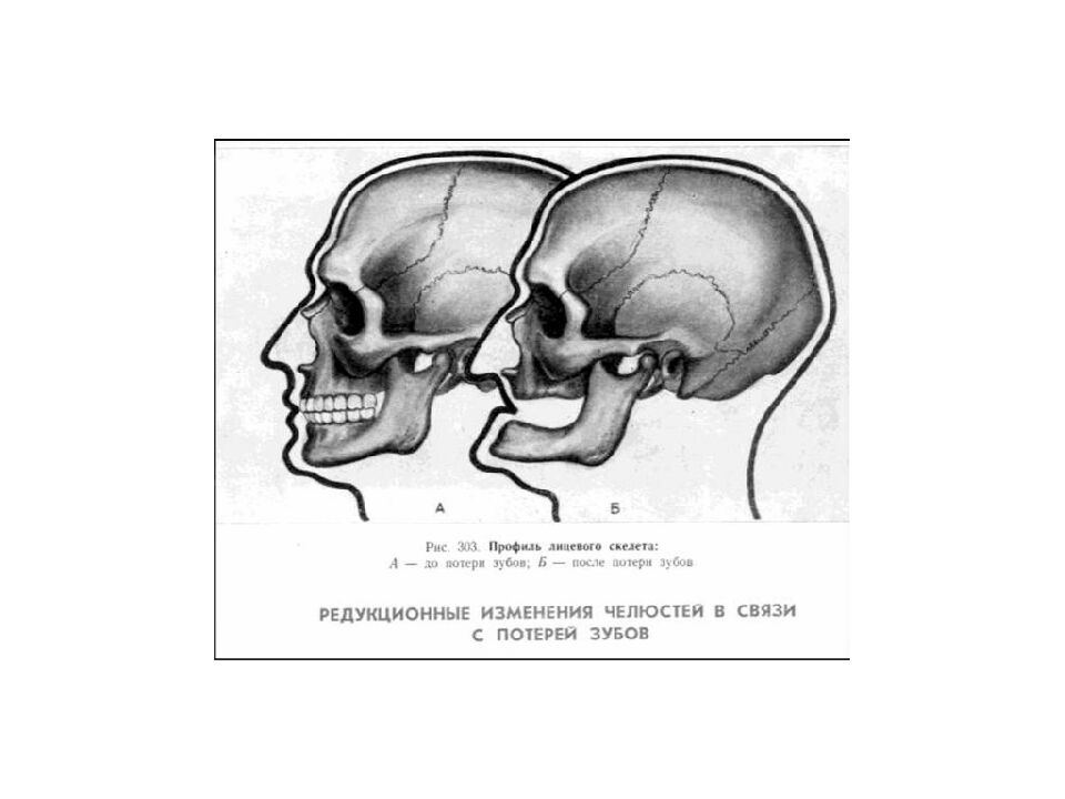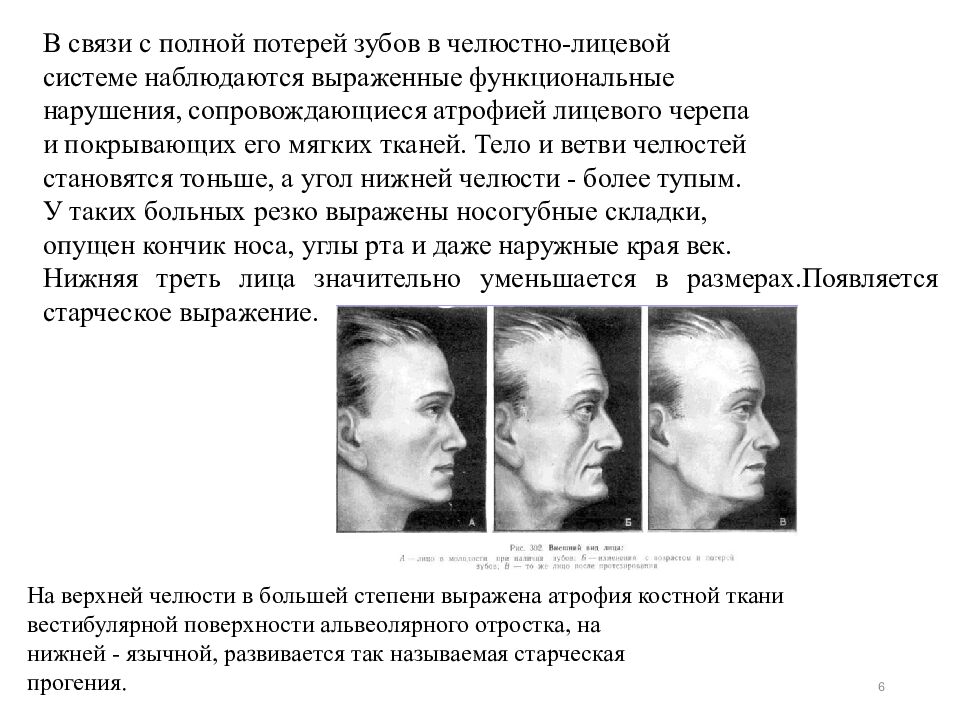 6 В связи с полной потерей зубов в челюстно-лицевой системе наблюдаются выраженные функциональные нарушения, сопровождающиеся атрофией лицевого черепа и покрывающих его мягких тканей. Тело и ветви челюстей становятся тоньше, а угол нижней челюсти - более тупым. У таких больных резко выражены носогубные складки, опущен кончик носа, углы рта и даже наружные края век. Нижняя треть лица значительно уменьшается в размерах.Появляется старческое выражение. На верхней челюсти в большей степени выражена атрофия костной ткани вестибулярной поверхности альвеолярного отростка, на нижней - язычной, развивается так называемая старческая прогения.
