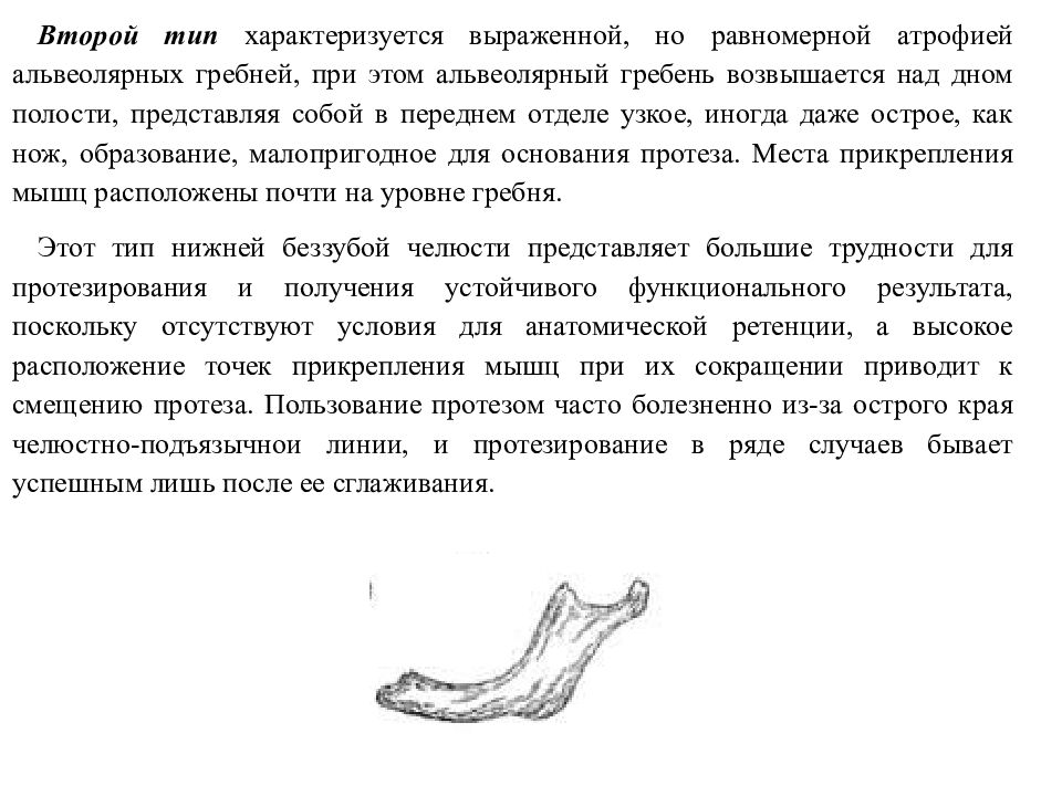 Второй тип характеризуется выраженной, но равномерной атрофией альвеолярных гребней, при этом альвеолярный гребень возвышается над дном полости, представляя собой в переднем отделе узкое, иногда даже острое, как нож, образование, малопригодное для основания протеза. Места прикрепления мышц расположены почти на уровне гребня. Этот тип нижней беззубой челюсти представляет большие трудности для протезирования и получения устойчивого функционального результата, поскольку отсутствуют условия для анатомической ретенции, а высокое расположение точек прикрепления мышц при их сокращении приводит к смещению протеза. Пользование протезом часто болезненно из-за острого края челюстно-подъязычнои линии, и протезирование в ряде случаев бывает успешным лишь после ее сглаживания.