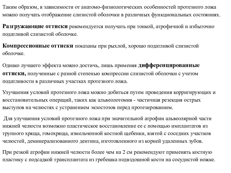 Таким образом, в зависимости от анатомо-физиологических особенностей протезного ложа можно получать отображение слизистой оболочки в различных функциональных состояниях. Разгружающие оттиски рекомендуется получать при тонкой, атрофичной и избыточно податливой слизистой оболочке. Компрессионные оттиски показаны при рыхлой, хорошо податливой слизистой оболочке. Однако лучшего эффекта можно достичь, лишь применяя дифференцированные оттиски, полученные с разной степенью компрессии слизистой оболочки с учетом податливости в различных участках протезного ложа. Улучшения условий протезного ложа можно добиться путем проведения корригирующих и восстановительных операций, таких как альвеолотомия - частичная резекция острых выступов на челюстях с устранением экзостозов перед протезированием. Для улучшения условий протезного ложа при значительной атрофии альвеолярной части нижней челюсти возможно пластическое восстановление ее с помощью имплантатов из трупного хряща, гомохряща, измельченной костной щебенки, взятой с соседних участков челюстей, деминерализованного дентина, изготовленного из корней удаленных зубов. При резкой атрофии нижней челюсти более чем на 2 см рекомендуют применять костную пластику с подсадкой трансплантата из гребешка подвздошной кости на сосудистой ножке.