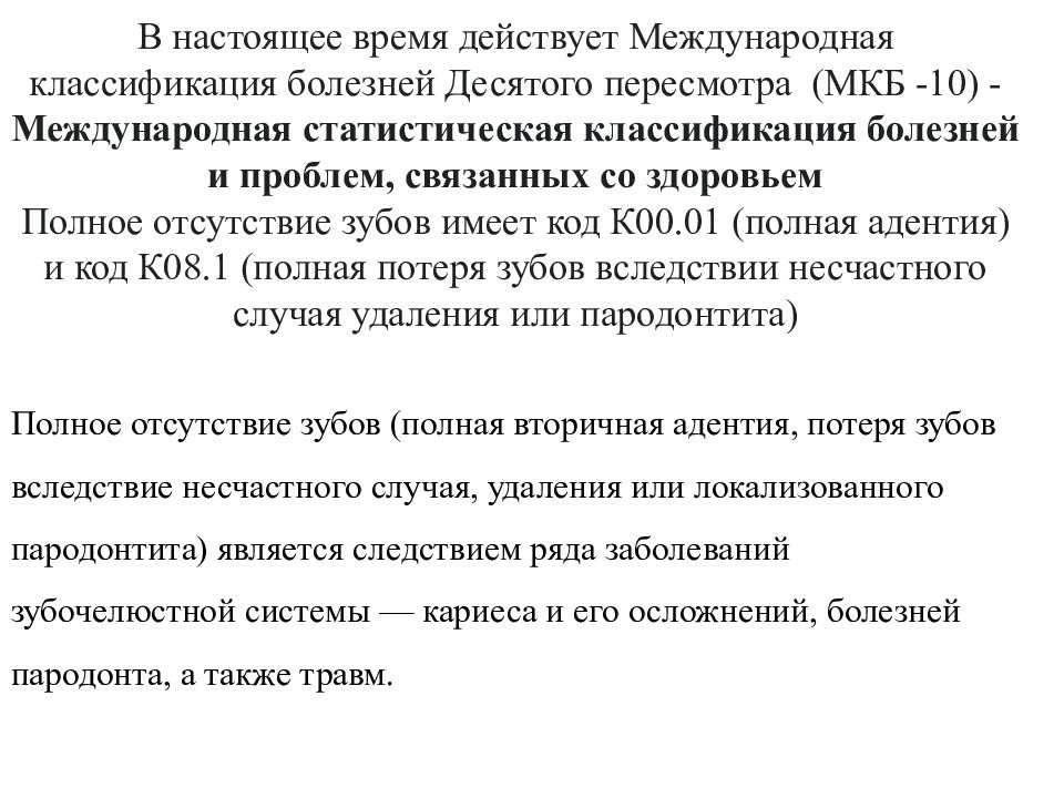 В настоящее время действует Международная классификация болезней Десятого пересмотра (МКБ -10) - Международная статистическая классификация болезней и проблем, связанных со здоровьем Полное отсутствие зубов имеет код К00.01 (полная адентия) и код К08.1 (полная потеря зубов вследствии несчастного случая удаления или пародонтита) Полное отсутствие зубов (полная вторичная адентия, потеря зубов вследствие несчастного случая, удаления или локализованного пародонтита) является следствием ряда заболеваний зубочелюстной системы — кариеса и его осложнений, болезней пародонта, а также травм.