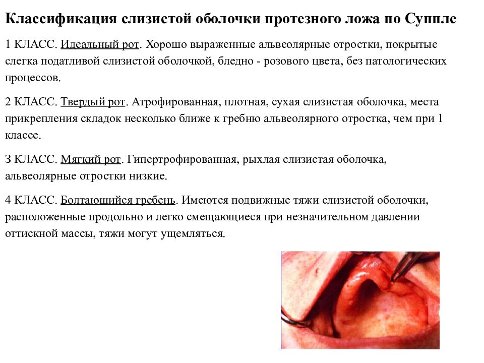 Классификация слизистой оболочки протезного ложа по Суппле 1 КЛАСС. Идеальный рот. Хорошо выраженные альвеолярные отростки, покрытые слегка податливой слизистой оболочкой, бледно - розового цвета, без патологических процессов. 2 КЛАСС. Твердый рот. Атрофированная, плотная, сухая слизистая оболочка, места прикрепления складок несколько ближе к гребню альвеолярного отростка, чем при 1 классе. З КЛАСС. Мягкий рот. Гипертрофированная, рыхлая слизистая оболочка, альвеолярные отростки низкие. 4 КЛАСС. Болтающийся гребень. Имеются подвижные тяжи слизистой оболочки, расположенные продольно и легко смещающиеся при незначительном давлении оттискной массы, тяжи могут ущемляться.