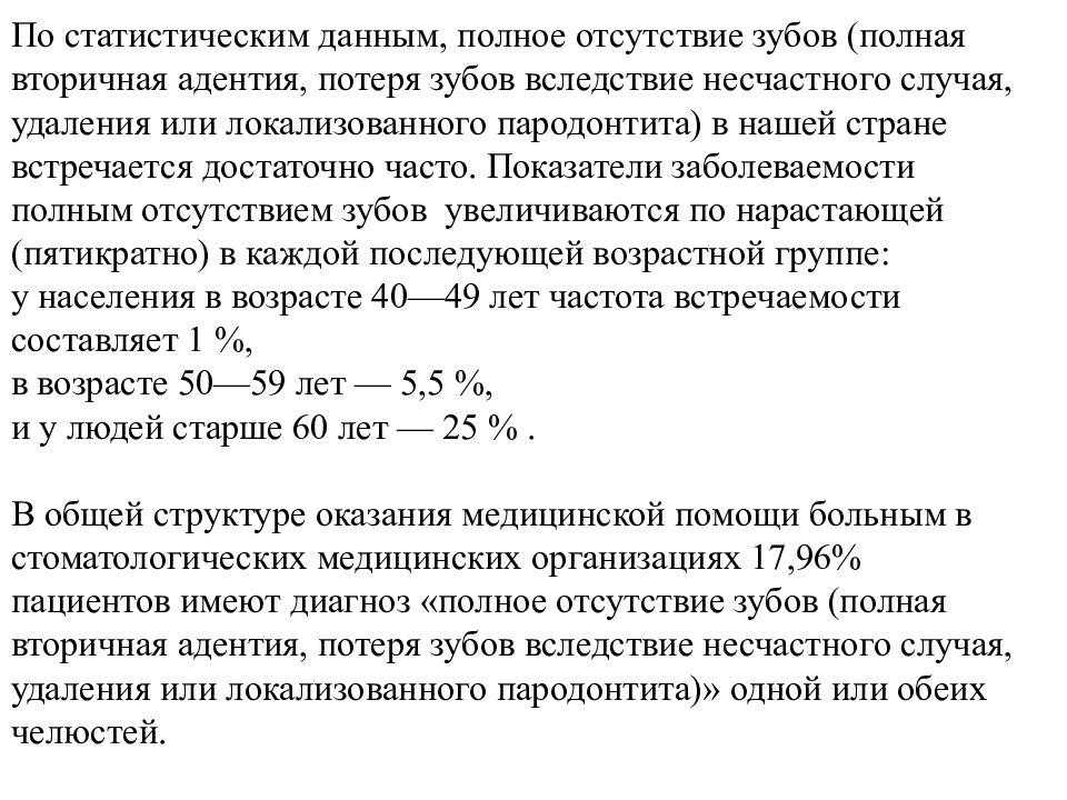 По статистическим данным, полное отсутствие зубов (полная вторичная адентия, потеря зубов вследствие несчастного случая, удаления или локализованного пародонтита) в нашей стране встречается достаточно часто. Показатели заболеваемости полным отсутствием зубов увеличиваются по нарастающей (пятикратно) в каждой последующей возрастной группе: у населения в возрасте 40—49 лет частота встречаемости составляет 1 %, в возрасте 50—59 лет — 5,5 %, и у людей старше 60 лет — 25 %. В общей структуре оказания медицинской помощи больным в стоматологических медицинских организациях 17,96% пациентов имеют диагноз «полное отсутствие зубов (полная вторичная адентия, потеря зубов вследствие несчастного случая, удаления или локализованного пародонтита)» одной или обеих челюстей.