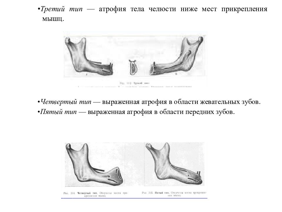 • Третий тип — атрофия тела челюсти ниже мест прикрепления мышц. • Четвертый тип — выраженная атрофия в области жевательных зубов. • Пятый тип — выраженная атрофия в области передних зубов.