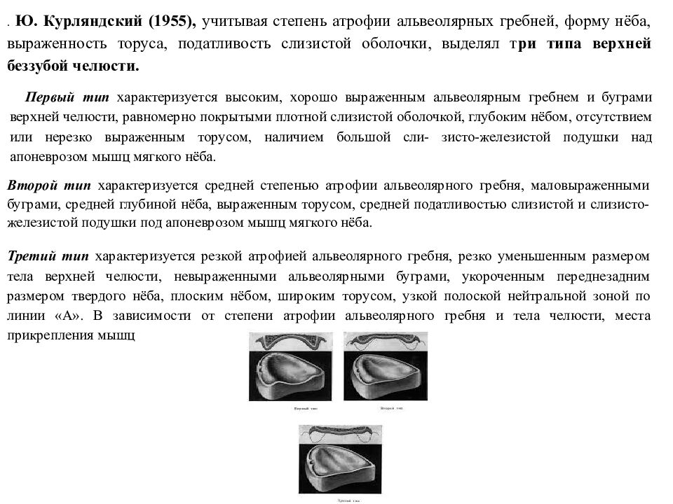 . Ю. Курляндский (1955), учитывая степень атрофии альвеолярных гребней, форму нёба, выраженность торуса, податливость слизистой оболочки, выделял т ри типа верхней беззубой челюсти. Первый тип характеризуется высоким, хорошо выраженным альвеолярным гребнем и буграми верхней челюсти, равномерно покрытыми плотной слизистой оболочкой, глубоким нёбом, отсутствием или нерезко выраженным торусом, наличием большой сли- зисто-железистой подушки над апоневрозом мышц мягкого нёба. Второй тип характеризуется средней степенью атрофии альвеолярного гребня, маловыраженными буграми, средней глубиной нёба, выраженным торусом, средней податливостью слизистой и слизисто-железистой подушки под апоневрозом мышц мягкого нёба. Третий тип характеризуется резкой атрофией альвеолярного гребня, резко уменьшенным размером тела верхней челюсти, невыраженными альвеолярными буграми, укороченным переднезадним размером твердого нёба, плоским нёбом, широким торусом, узкой полоской нейтральной зоной по линии «А». В зависимости от степени атрофии альвеолярного гребня и тела челюсти, места прикрепления мышц
