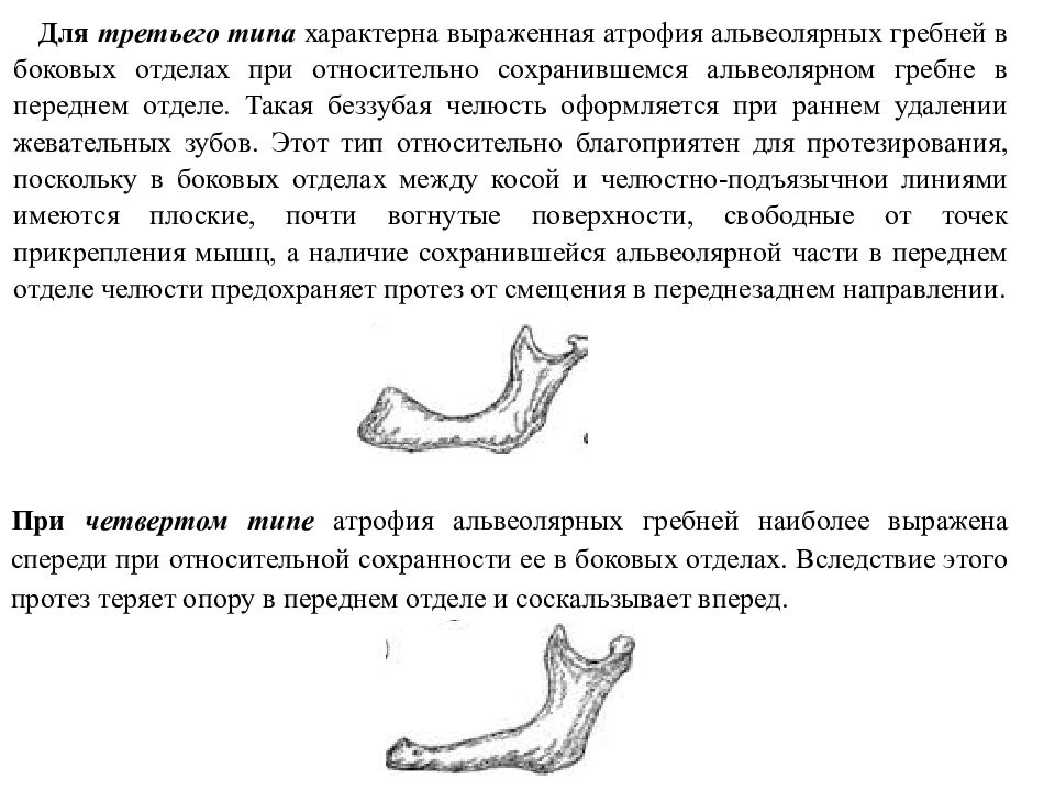 Для третьего типа характерна выраженная атрофия альвеолярных гребней в боковых отделах при относительно сохранившемся альвеолярном гребне в переднем отделе. Такая беззубая челюсть оформляется при раннем удалении жевательных зубов. Этот тип относительно благоприятен для протезирования, поскольку в боковых отделах между косой и челюстно-подъязычнои линиями имеются плоские, почти вогнутые поверхности, свободные от точек прикрепления мышц, а наличие сохранившейся альвеолярной части в переднем отделе челюсти предохраняет протез от смещения в переднезаднем направлении. При четвертом типе атрофия альвеолярных гребней наиболее выражена спереди при относительной сохранности ее в боковых отделах. Вследствие этого протез теряет опору в переднем отделе и соскальзывает вперед. Курляндский построил свою классификацию с учётом не только убыли костной ткани альвеолярной части беззубой нижней челюсти, но также от изменения топографии и места прикрепления сухожилий мышц. ти и