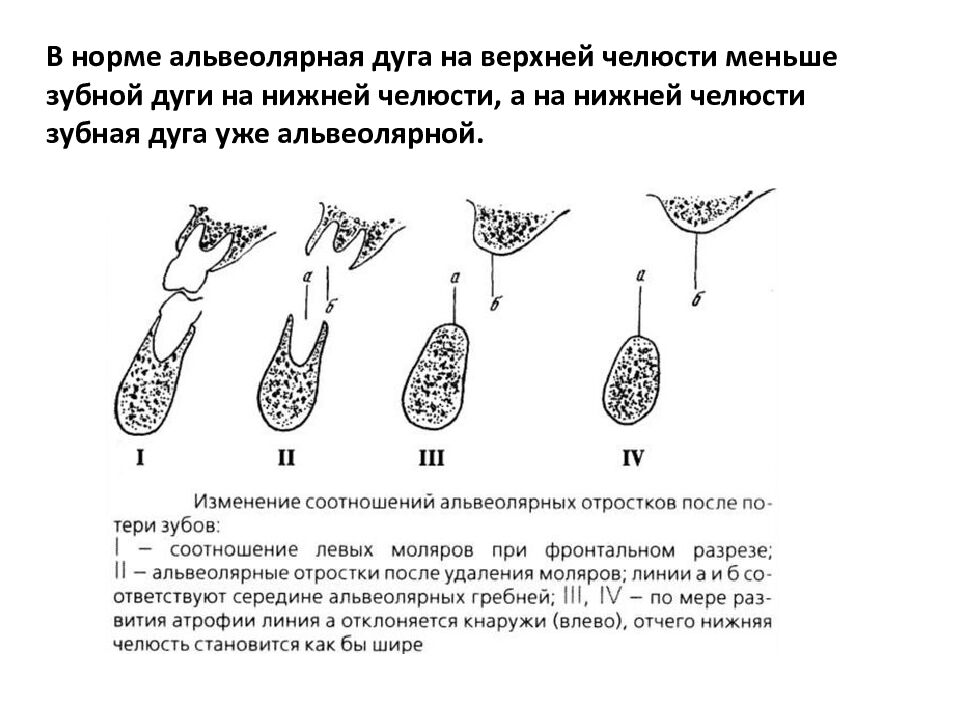 В норме альвеолярная дуга на верхней челюсти меньше зубной дуги на нижней челюсти, а на нижней челюсти зубная дуга уже альвеолярной.