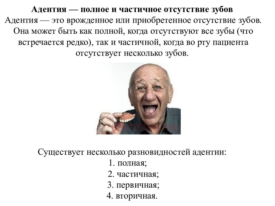 Адентия — полное и частичное отсутствие зубов Адентия — это врожденное или приобретенное отсутствие зубов. Она может быть как полной, когда отсутствуют все зубы (что встречается редко), так и частичной, когда во рту пациента отсутствует несколько зубов. Существует несколько разновидностей адентии: 1. полная; 2. частичная; 3. первичная; 4. вторичная.