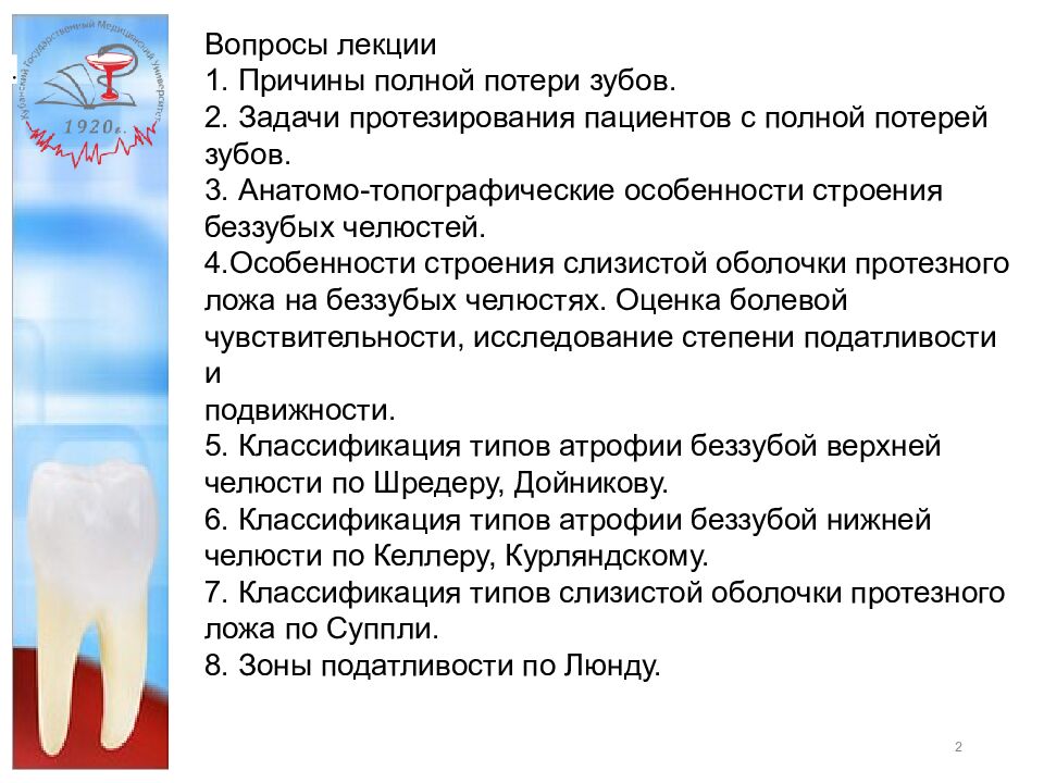2 . Вопросы лекции 1. Причины полной потери зубов. 2. Задачи протезирования пациентов с полной потерей зубов. 3. Анатомо-топографические особенности строения беззубых челюстей. 4.Особенности строения слизистой оболочки протезного ложа на беззубых челюстях. Оценка болевой чувствительности, исследование степени податливости и подвижности. 5. Классификация типов атрофии беззубой верхней челюсти по Шредеру, Дойникову. 6. Классификация типов атрофии беззубой нижней челюсти по Келлеру, Курляндскому. 7. Классификация типов слизистой оболочки протезного ложа по Суппли. 8. Зоны податливости по Люнду.