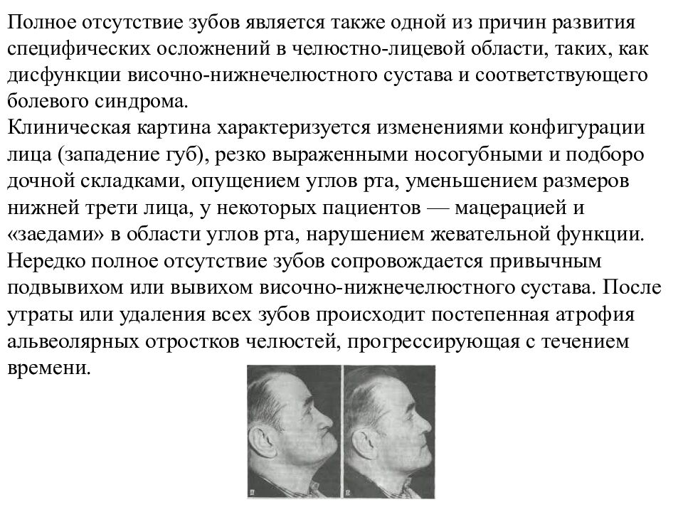 Полное отсутствие зубов является также одной из причин развития специфических осложнений в челюстно-лицевой области, таких, как дисфункции височно-нижнечелюстного сустава и соответствующего болевого синдрома. Клиническая картина характеризуется изменениями конфигурации лица (западение губ), резко выраженными носогубными и подбородочной складками, опущением углов рта, уменьшением размеров нижней трети лица, у некоторых пациентов — мацерацией и «заедами» в области углов рта, нарушением жевательной функции. Нередко полное отсутствие зубов сопровождается привычным подвывихом или вывихом височно-нижнечелюстного сустава. После утраты или удаления всех зубов происходит постепенная атрофия альвеолярных отростков челюстей, прогрессирующая с течением времени.