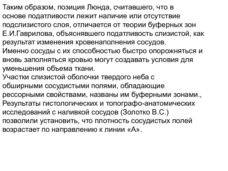 Таким образом, позиция Люнда, считавшего, что в основе податливости лежит наличие или отсутствие подслизистого слоя, отличается от теории буферных зон Е.И.Гаврилова, объяснявшего податливость слизистой, как результат изменения кровенаполнения сосудов. Именно сосуды с их способностью быстро опорожняться и вновь заполняться кровью могут создавать условия для уменьшения объема ткани. Участки слизистой оболочки твердого неба с обширными сосудистыми полями, обладающие рессорными свойствами, названы им буферными зонами., Результаты гистологических и топографо-анатомических исследований с наливкой сосудов (Золотко В.С.) позволили установить, что плотность сосудистых полей возрастает по направлению к линии «А».