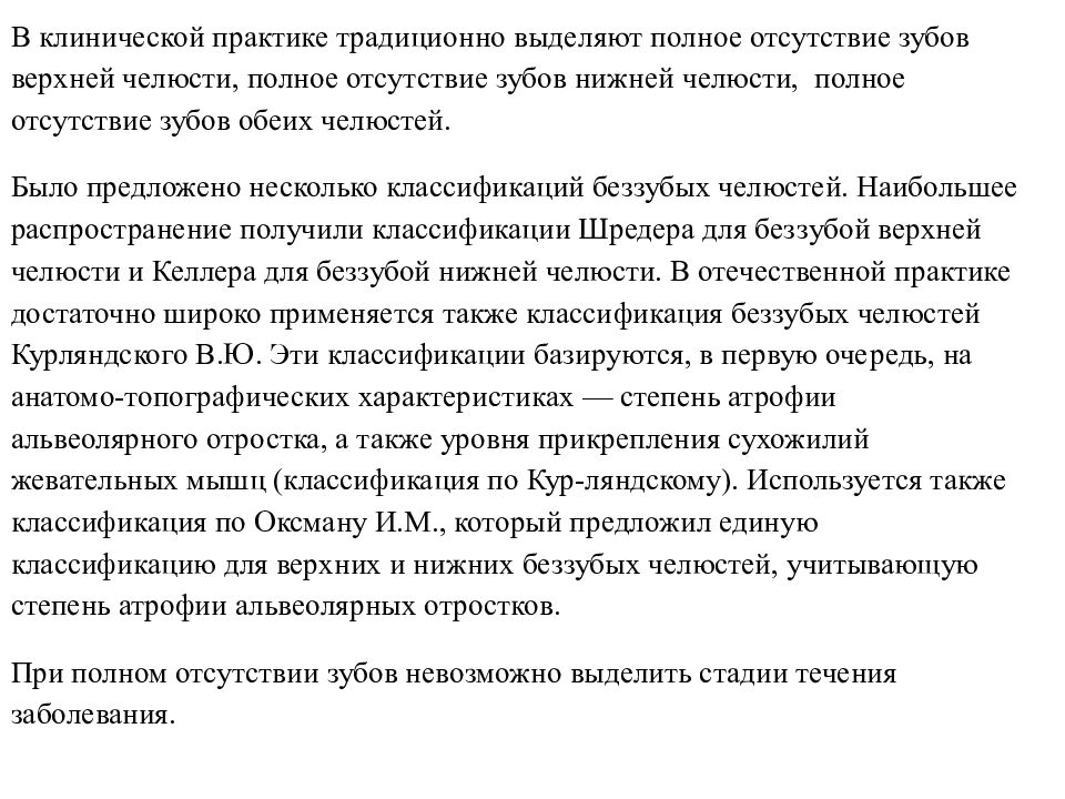 В клинической практике традиционно выделяют полное отсутствие зубов верхней челюсти, полное отсутствие зубов нижней челюсти, полное отсутствие зубов обеих челюстей. Было предложено несколько классификаций беззубых челюстей. Наибольшее распространение получили классификации Шредера для беззубой верхней челюсти и Келлера для беззубой нижней челюсти. В отечественной практике достаточно широко применяется также классификация беззубых челюстей Курляндского В.Ю. Эти классификации базируются, в первую очередь, на анатомо-топографических характеристиках — степень атрофии альвеолярного отростка, а также уровня прикрепления сухожилий жевательных мышц (классификация по Кур-ляндскому). Используется также классификация по Оксману И.М., который предложил единую классификацию для верхних и нижних беззубых челюстей, учитывающую степень атрофии альвеолярных отростков. При полном отсутствии зубов невозможно выделить стадии течения заболевания.