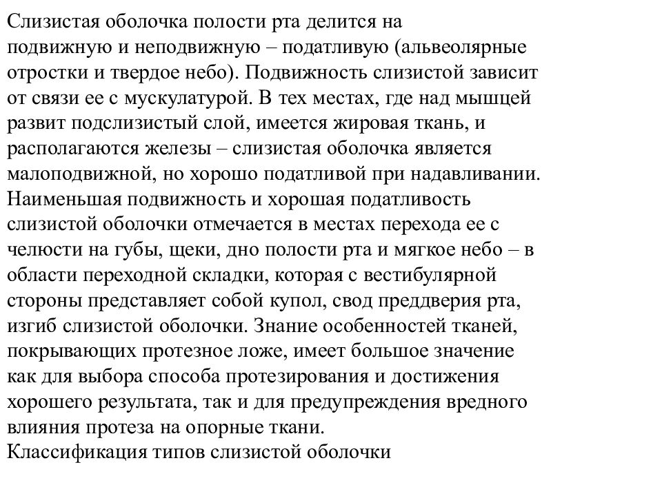 Слизистая оболочка полости рта делится на подвижную и неподвижную – податливую (альвеолярные отростки и твердое небо). Подвижность слизистой зависит от связи ее с мускулатурой. В тех местах, где над мышцей развит подслизистый слой, имеется жировая ткань, и располагаются железы – слизистая оболочка является малоподвижной, но хорошо податливой при надавливании. Наименьшая подвижность и хорошая податливость слизистой оболочки отмечается в местах перехода ее с челюсти на губы, щеки, дно полости рта и мягкое небо – в области переходной складки, которая с вестибулярной стороны представляет собой купол, свод преддверия рта, изгиб слизистой оболочки. Знание особенностей тканей, покрывающих протезное ложе, имеет большое значение как для выбора способа протезирования и достижения хорошего результата, так и для предупреждения вредного влияния протеза на опорные ткани. Классификация типов слизистой оболочки