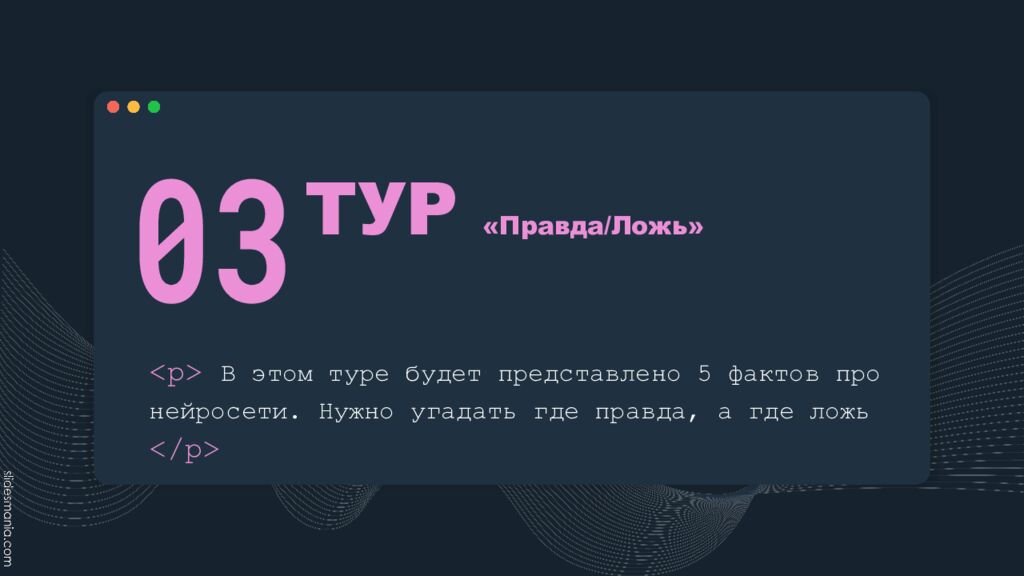 <p> В этом туре будет представлено 5 фактов про нейросети. Нужно угадать где правда, а где ложь </p> ТУР «Правда/Ложь»
