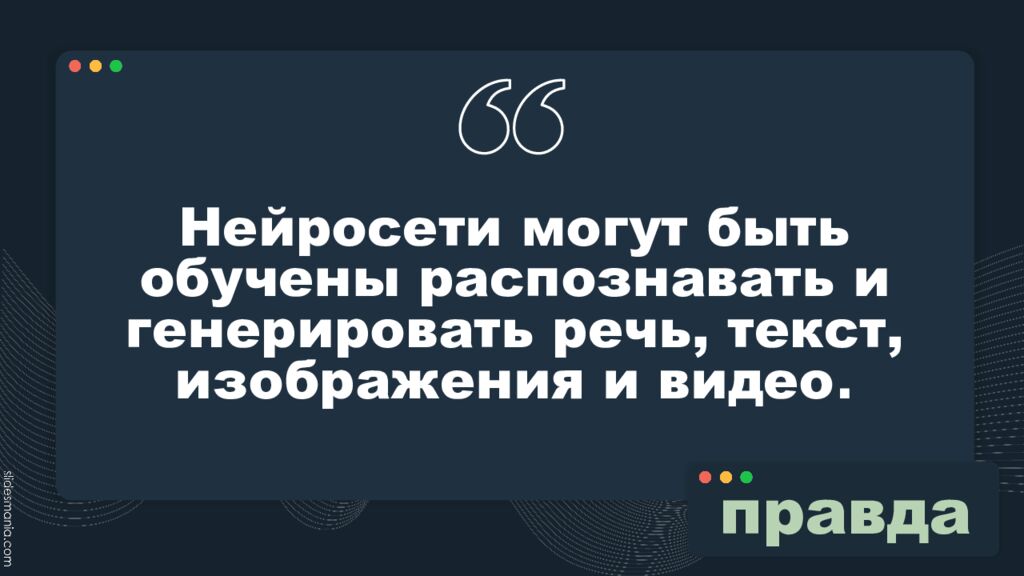 Нейросети могут быть обучены распознавать и генерировать речь, текст, изображения и видео.