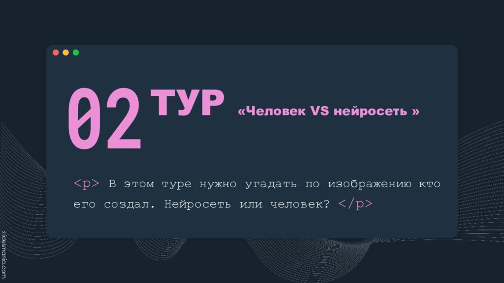 <p> В этом туре нужно угадать по изображению кто его создал. Нейросеть или человек? </p> ТУР «Человек VS нейросеть »