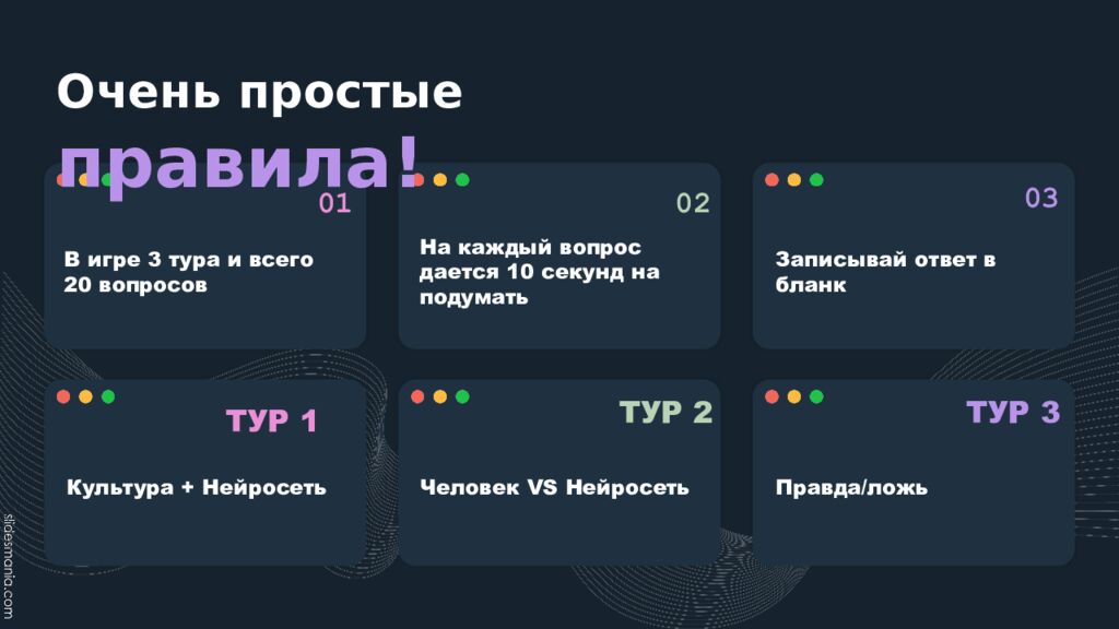 ТУР 3 Очень простые правила! В игре 3 тура и всего 20 вопросов На каждый вопрос дается 10 секунд на подумать Человек VS Нейросеть Записывай ответ в бланк Правда/ложь 01 02 03 ТУР 1 Культура + Нейросеть ТУР 2