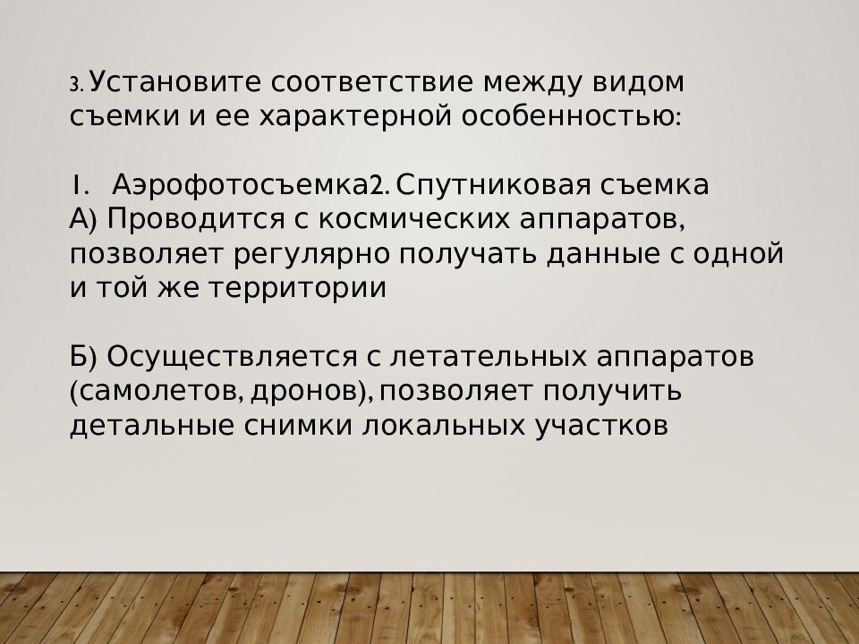 3. Установите соответствие между видом съемки и ее характерной особенностью: Аэрофотосъемка 2. Спутниковая съемка А) Проводится с космических аппаратов, позволяет регулярно получать данные с одной и той же территории Б) Осуществляется с летательных аппаратов (самолетов, дронов), позволяет получить детальные снимки локальных участков