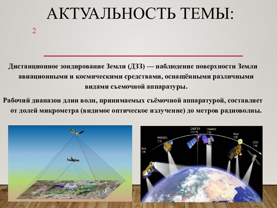 Дистанционное зондирование Земли (ДЗЗ) — наблюдение поверхности Земли авиационными и космическими средствами, оснащёнными различными видами съемочной аппаратуры. Рабочий диапазон длин волн, принимаемых съёмочной аппаратурой, составляет от долей микрометра (видимое оптическое излучение) до метров радиоволны. 2