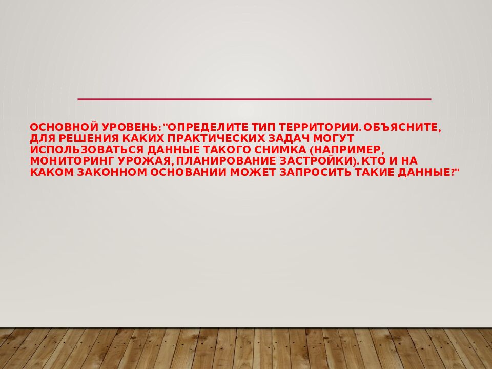 Слайд 16: Основной уровень: "Определите тип территории. Объясните, для решения каких практических задач могут использоваться данные такого снимка (например, мониторинг урожая, планирование застройки). Кто и на каком законном основании может запросить такие данные?"