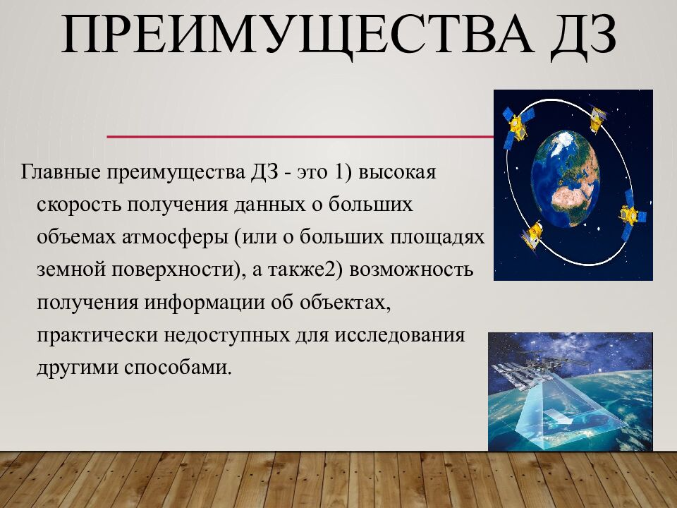 Главные преимущества ДЗ - это 1) высокая скорость получения данных о больших объемах атмосферы (или о больших площадях земной поверхности), а также2) возможность получения информации об объектах, практически недоступных для исследования другими способами.