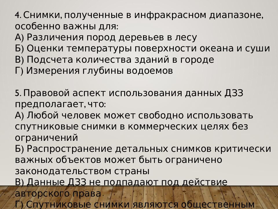 4. Снимки, полученные в инфракрасном диапазоне, особенно важны для: А) Различения пород деревьев в лесу Б) Оценки температуры поверхности океана и суши В) Подсчета количества зданий в городе Г) Измерения глубины водоемов 5. Правовой аспект использования данных ДЗЗ предполагает, что: А) Любой человек может свободно использовать спутниковые снимки в коммерческих целях без ограничений Б) Распространение детальных снимков критически важных объектов может быть ограничено законодательством страны В) Данные ДЗЗ не подпадают под действие авторского права Г) Спутниковые снимки являются общественным достоянием сразу после их получения