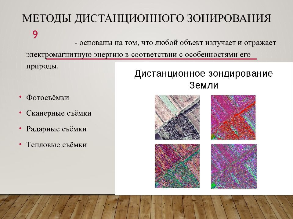 - основаны на том, что любой объект излучает и отражает электромагнитную энергию в соответствии с особенностями его природы. Фотосъёмки Сканерные съёмки Радарные съёмки Тепловые съёмки 9