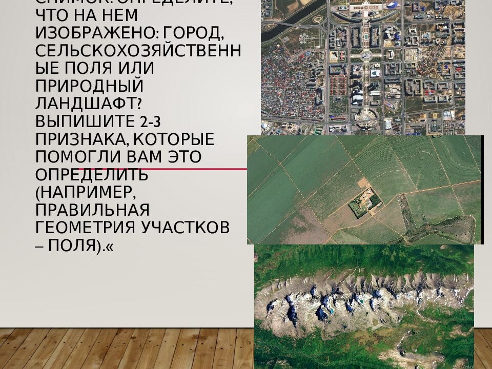 Слайд 15: Задание №2 Базовый уровень: "Рассмотрите снимок. Определите, что на нем изображено: город, сельскохозяйственные поля или природный ландшафт? Выпишите 2-3 признака, которые помогли вам это определить (например, правильная геометрия участков – поля).«