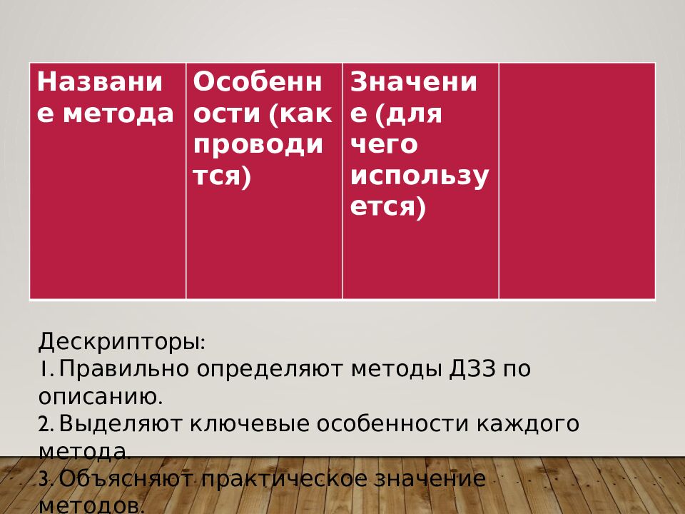 3 Название метода Особенности (как проводится) Значение (для чего используется) Дескрипторы: 1. Правильно определяют методы ДЗЗ по описанию. 2. Выделяют ключевые особенности каждого метода. 3. Объясняют практическое значение методов.