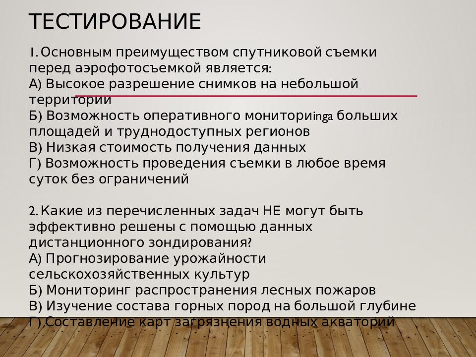 1. Основным преимуществом спутниковой съемки перед аэрофотосъемкой является: А) Высокое разрешение снимков на небольшой территории Б) Возможность оперативного мониториinga больших площадей и труднодоступных регионов В) Низкая стоимость получения данных Г) Возможность проведения съемки в любое время суток без ограничений 2. Какие из перечисленных задач НЕ могут быть эффективно решены с помощью данных дистанционного зондирования? А) Прогнозирование урожайности сельскохозяйственных культур Б) Мониторинг распространения лесных пожаров В) Изучение состава горных пород на большой глубине Г) Составление карт загрязнения водных акваторий