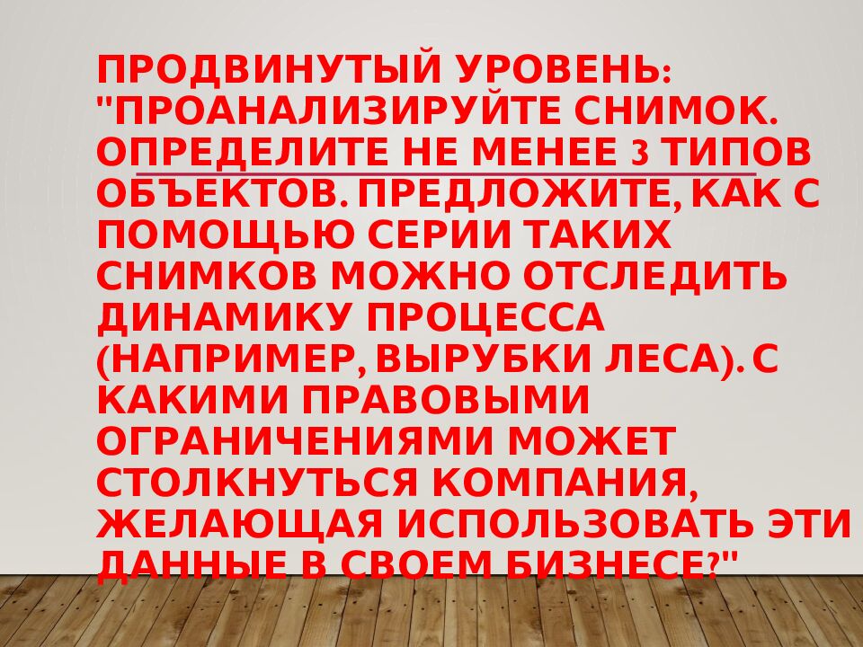 Слайд 17: Продвинутый уровень: "Проанализируйте снимок. Определите не менее 3 типов объектов. Предложите, как с помощью серии таких снимков можно отследить динамику процесса (например, вырубки леса). С какими правовыми ограничениями может столкнуться компания, желающая использовать эти данные в своем бизнесе?"