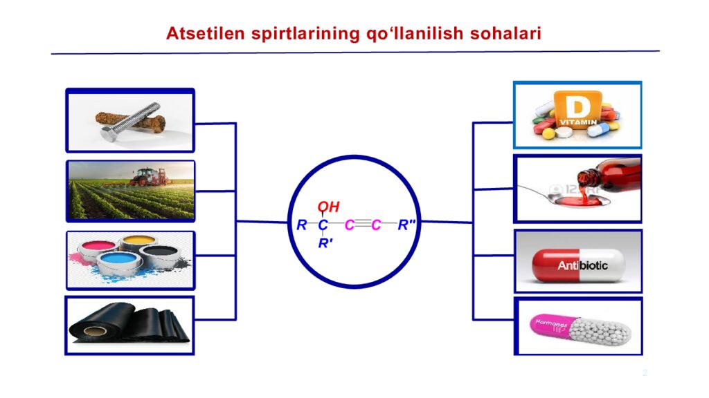 1 O’ZBEKISTON RESPUBLIKASI OLIY TA’LIM, FAN VA INNOVATSIYALAR VAZIRLIGI 60530200- Neft va gaz kimyosi yo’nalishi 4-kurs talabasi Dexqonova Muxtabar Abdurashid qizi MAVZU: Uglevodorod xomashyolari asosida atsetilen spirtlari sintezi va texnologiyasi Ilmiy rahbar : katta o'qituvchi Phd, S.S.Abduraxmanova MIRZO ULUG’BEK NOMIDAGI O’ZBEKISTON MILLIYUNIVERSITETI