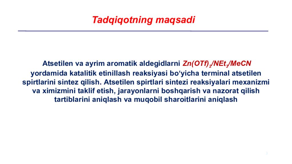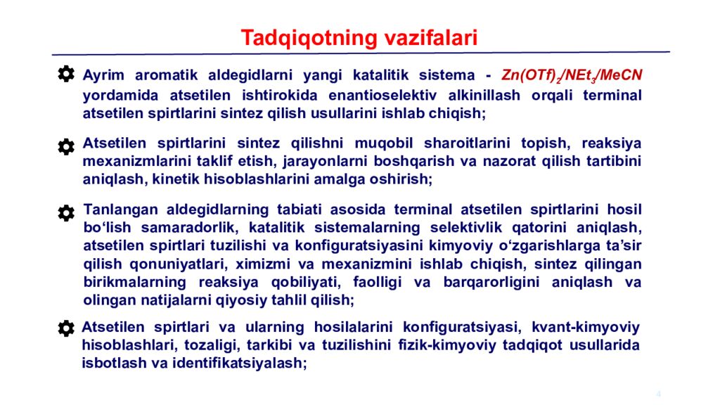 3 Tadqiqotning maqsadi Atsetilen va ayrim aromatik aldegidlarni Zn(OTf) 2 /NEt 3 /MeCN yordamida katalitik etinillash reaksiyasi bo‘yicha terminal atsetilen spirtlarini sintez qilish. A tsetilen spirtlari sintezi reaksiyalari mexanizmi va ximizmini taklif etish, jarayonlarni boshqarish va nazorat qilish tartiblarini aniqlash va muqobil sharoitlarini aniqlash