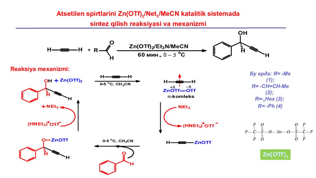 Atsetilen spirtlarini Z n ( OTf ) 2 /Net 3 / MeCN katalitik sistemada sintez qilish reaksiyasi va mexanizmi Бу ерда : R= -Me (1); R= -CH=CH-Me (2); R=- c Hex (3); R= - Ph (4) Reaksiya mexanizmi : Z n(OTf) 2
