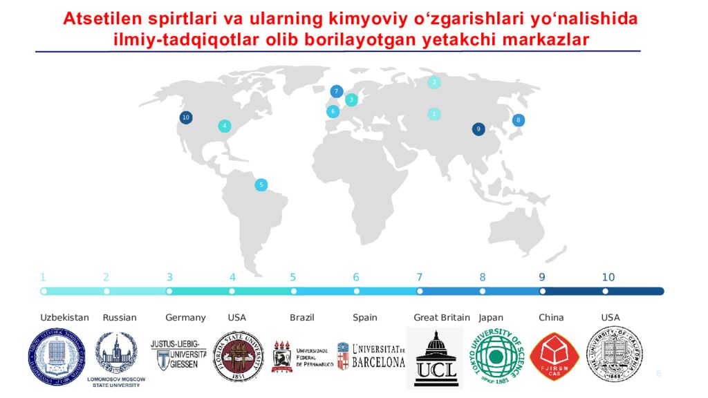 7 4 3 6 5 1 9 2 8 10 Great Britain USA Spain Germany Brazil Uzbekistan Russian China Japan USA А tsetilen spirtlari va ularning kimyoviy o‘zgarishlari yo‘nalishida ilmiy-tadqiqotlar olib borilayotgan yetakchi markazlar 1 2 3 4 5 6 7 8 9 10 6