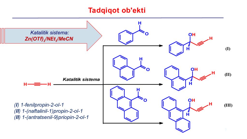 7 Katalitik sistema : Zn(OTf) 2 /NEt 3 /MeCN Tadqiqot ob'ekti ( I ) 1- fenilpropin -2- ol -1 ( II ) 1-( naftalinil -1) propin -2- ol -1 ( II ) 1-( antratsenil -9) priopin -2- ol -1