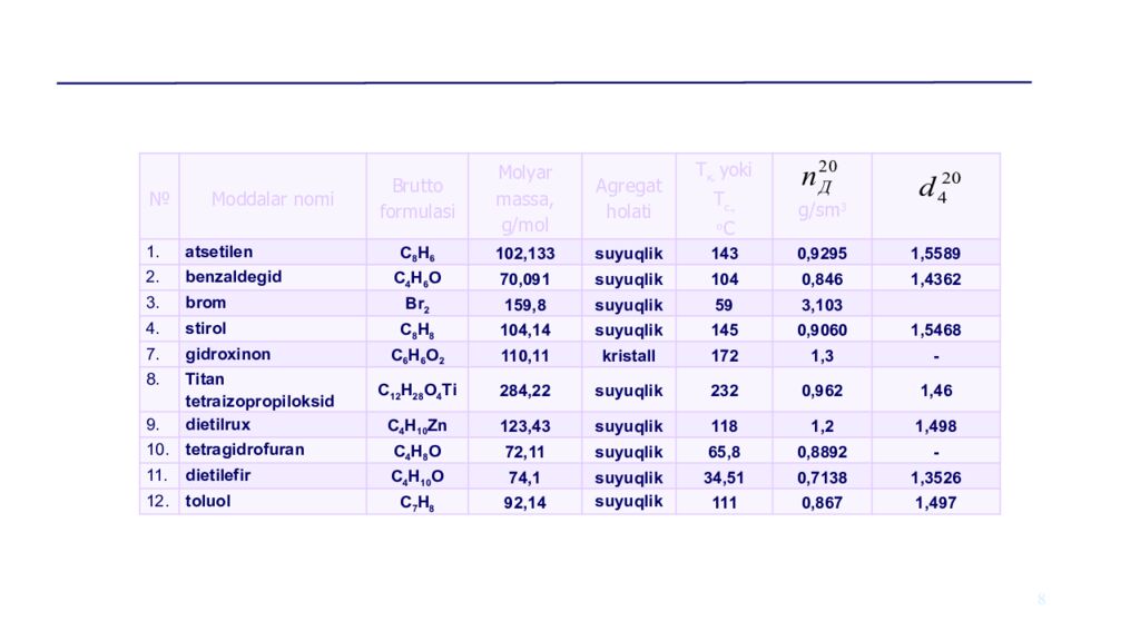 8 № Moddalar nomi Brutto formulasi Molyar massa, g/ mol Agregat holati Т қ. yoki Т с., о С g / sm 3 1. atsetilen C 8 H 6 102,133 suyuqlik 143 0,9295 1,5589 2. benzaldegid C 4 H 6 О 70,091 suyuqlik 104 0,846 1,4362 3. brom Br 2 159,8 suyuqlik 59 3,103 4. stirol C 8 H 8 104,14 suyuqlik 145 0,9060 1,5468 7. gidroxinon C 6 H 6 О 2 110,11 kristall 172 1,3 - 8. Titan tetraizopropiloksid С 12 Н 28 O 4 T i 284,22 suyuqlik 232 0,9 62 1,46 9. dietilrux C 4 H 10 Zn 123,43 suyuqlik 118 1,2 1,498 10. tetragidrofuran C 4 H 8 O 72,11 suyuqlik 65,8 0,8892 - 11. dietilefir C 4 H 10 O 74,1 suyuqlik 34,51 0,7138 1,3526 12. toluol С 7 Н 8 92, 14 suyuqlik 111 0,867 1, 497