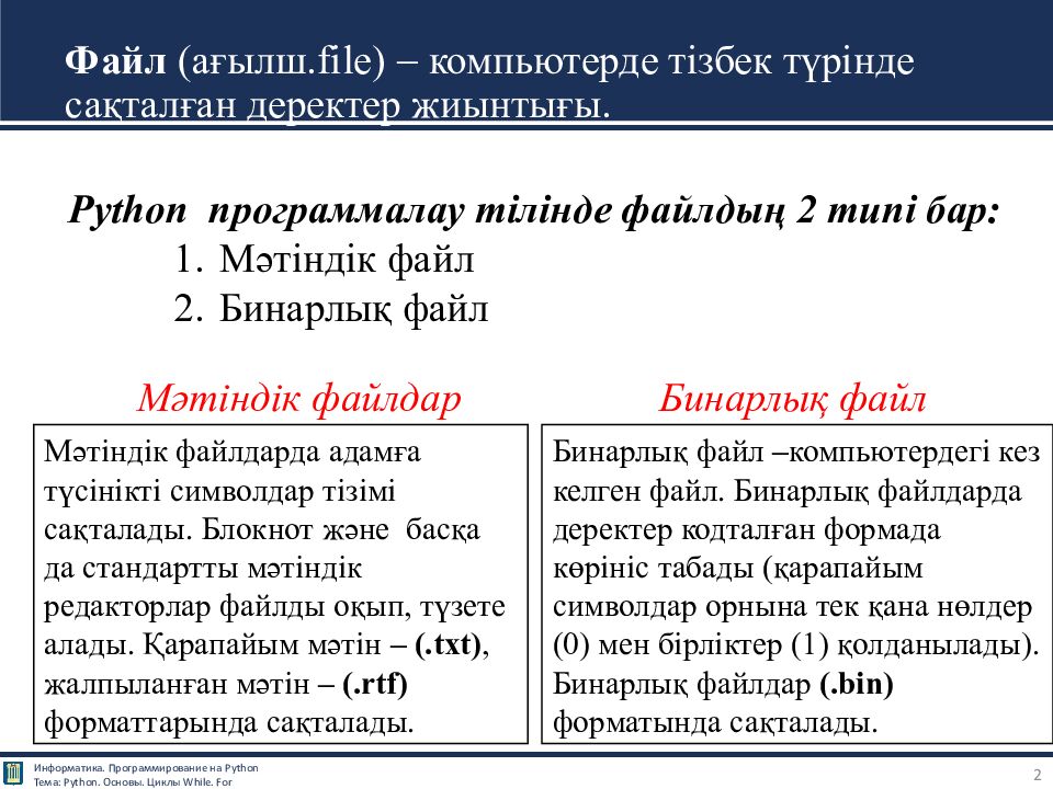 2 Файл (ағылш. file ) компьютерде тізбек түрінде сақталған деректер жиынтығы. Python программалау тілінде файлдың 2 типі бар: Мәтіндік файл Бинарлық файл Мәтіндік файлдар Мәтіндік файлдарда адамға түсінікті символдар тізімі сақталады. Блокнот және басқа да стандартты мәтіндік редакторлар файлды оқып, түзете алады. Қарапайым мәтін – (. txt ), жалпыланған мәтін – (. rtf) форматтарында сақталады. Бинарлық файл Бинарлық файл – компьютердегі кез келген файл. Бинарлық файлдарда деректер кодталған формада көрініс табады (қарапайым символдар орнына тек қана нөлдер (0) мен бірліктер (1) қолданылады). Бинарлық файлдар (.bin) форматында сақталады.