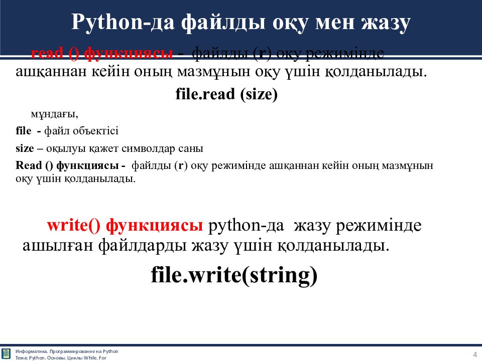 read () функциясы - файлды ( r ) оқу режимінде ашқаннан кейін оның мазмұнын оқу үшін қолданылады. f ile.read (size) мұндағы, file - файл объектісі size – оқылуы қажет символдар саны Read () функциясы - файлды ( r ) оқу режимінде ашқаннан кейін оның мазмұнын оқу үшін қолданылады. 4 Python -да файлды оқу мен жазу write () функциясы python -да жазу режимінде ашылған файлдарды жазу үшін қолданылады. file.write(string)