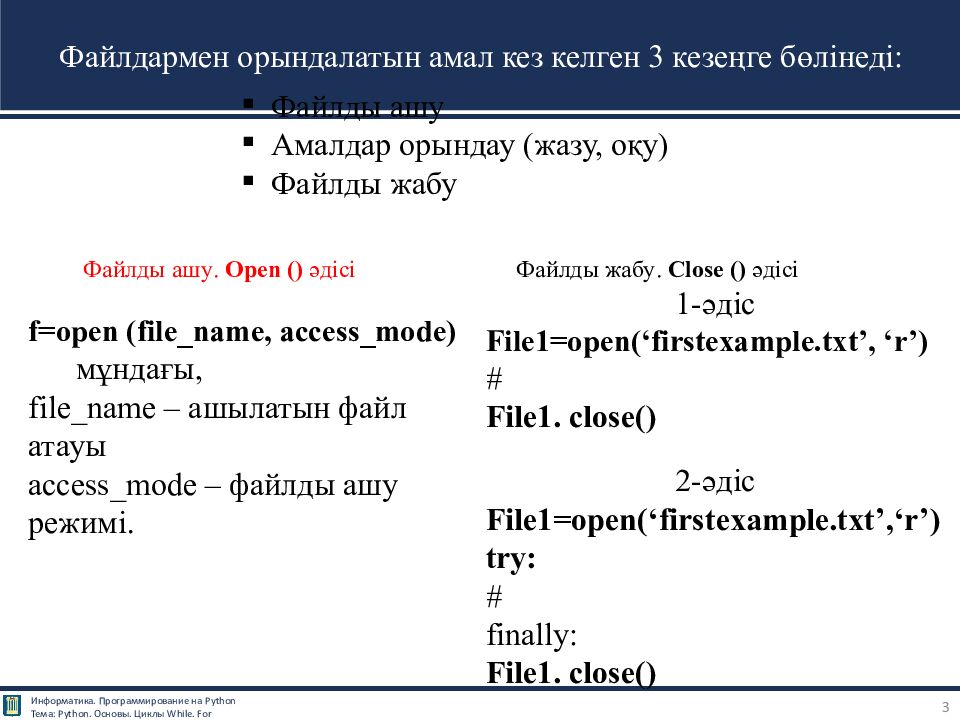 Слайд 3: Файлдармен орындалатын амал кез келген 3 кезеңге бөлінеді: