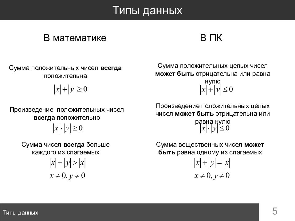 5 Типы данных Типы данных В математике Сумма положительных чисел всегда положительна Произведение положительных чисел всегда положительно Сумма чисел всегда больше каждого из слагаемых В ПК Сумма положительных целых чисел может быть отрицательна или равна нулю Произведение положительных целых чисел может быть отрицательна или равна нулю Сумма вещественных чисел может быть равна одному из слагаемых