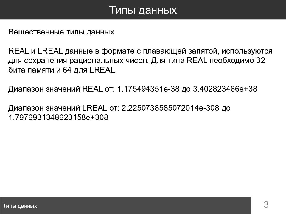3 Типы данных Типы данных Вещественные типы данных REAL и LREAL данные в формате с плавающей запятой, используются для сохранения рациональных чисел. Для типа REAL необходимо 32 бита памяти и 64 для LREAL. Диапазон значений REAL от: 1.175494351e-38 до 3.402823466e+38 Диапазон значений LREAL от: 2.2250738585072014e-308 до 1.7976931348623158e+308