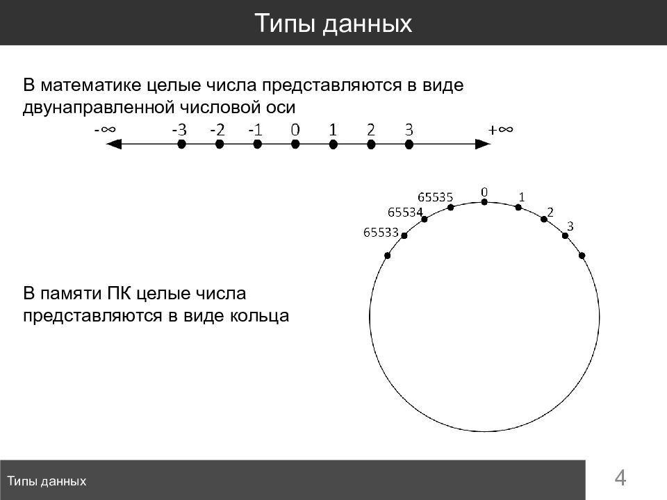 4 Типы данных Типы данных В памяти ПК целые числа представляются в виде кольца В математике целые числа представляются в виде двунаправленной числовой оси