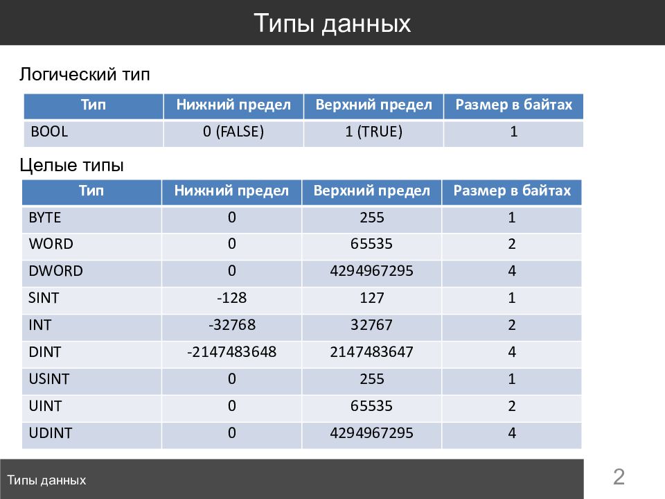 2 Типы данных Типы данных Тип Нижний предел Верхний предел Размер в байтах BOOL 0 ( FALSE ) 1 (TRUE) 1 Тип Нижний предел Верхний предел Размер в байтах BYTE 0 255 1 WORD 0 65535 2 DWORD 0 4294967295 4 SINT -128 127 1 INT -32768 32767 2 DINT -2147483648 2147483647 4 USINT 0 255 1 UINT 0 65535 2 UDINT 0 4294967295 4 Логический тип Целые типы
