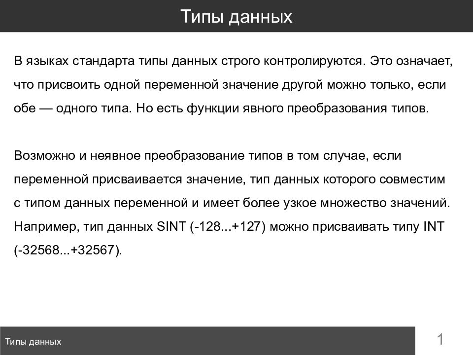 Последний слайд презентации: 1 Типы данных Типы данных В языках стандарта типы данных строго контролируются: В математике